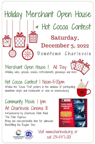 Warm up as you sample delicious cocoa creations from participating businesses. Vote for your favorite and help crown Charlevoix’s Best Hot Cocoa! Check back for the Cocoa Trail.